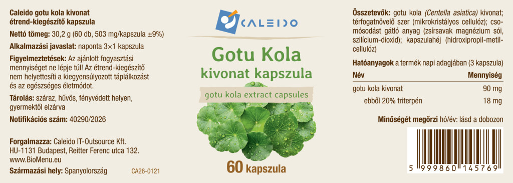 A Caleido Gotu Kola kivonat kapszula egy növényi alapú étrend-kiegészítő, amely a gotu kola (Centella asiatica) kivonatát tartalmazza. Ez a növény évszázadok óta ismert a hagyományos felhasználásban, és napjainkban is népszerű összetevője a tudatosan összeállított étrend-kiegészítőknek.